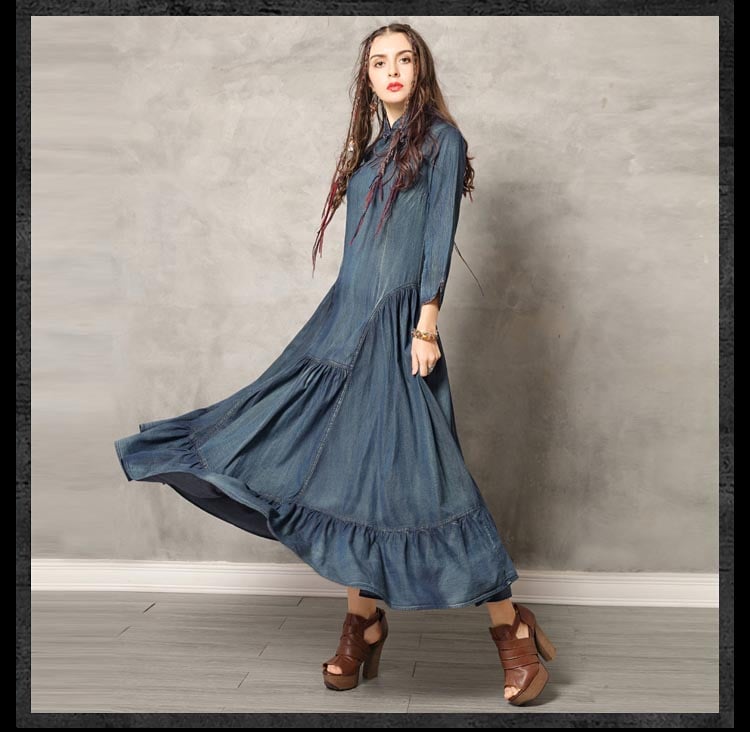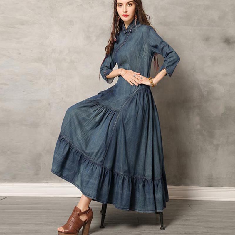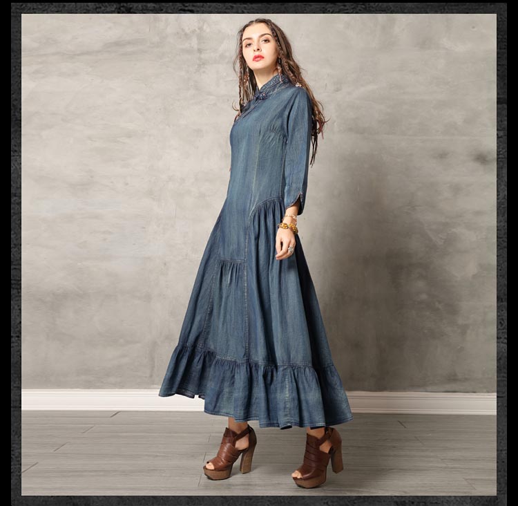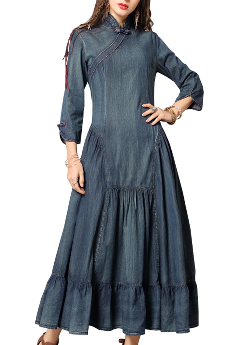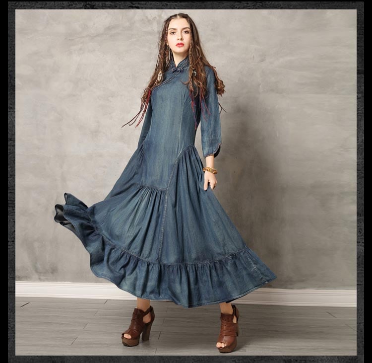 ARTKA KELSEY KEER CHEONGSAM HIGH NECK DENIM JEAN MAXI DRESS