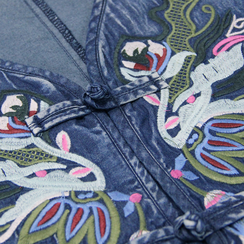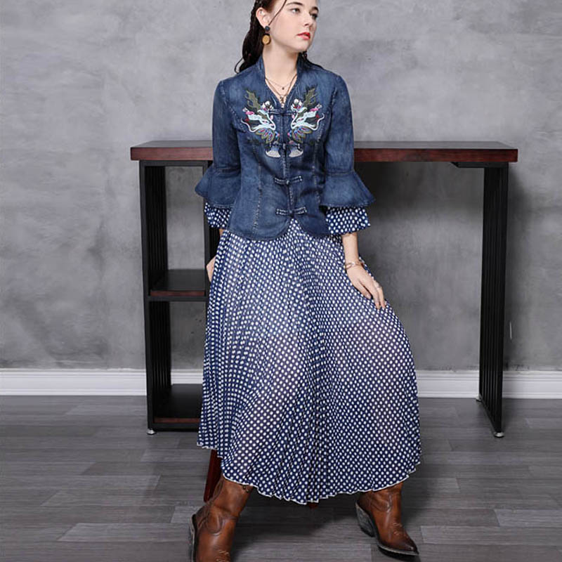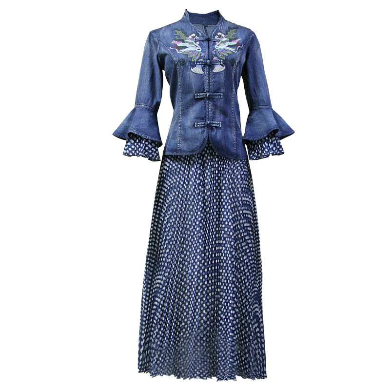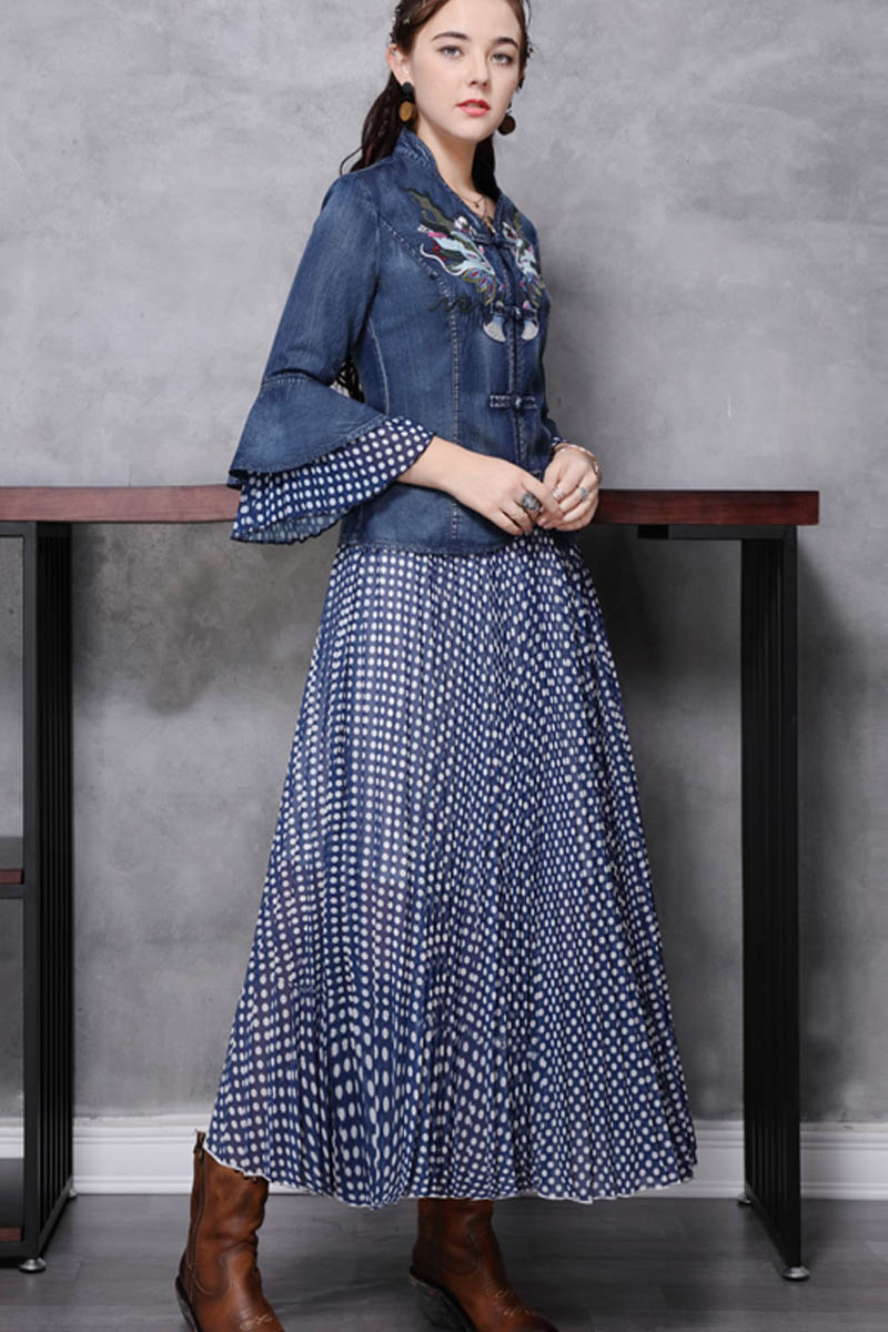 ARTKA MCKINNON KEER POLKA DOTS PLEATED TWO PIECE DENIM JEAN SUIT DRESS