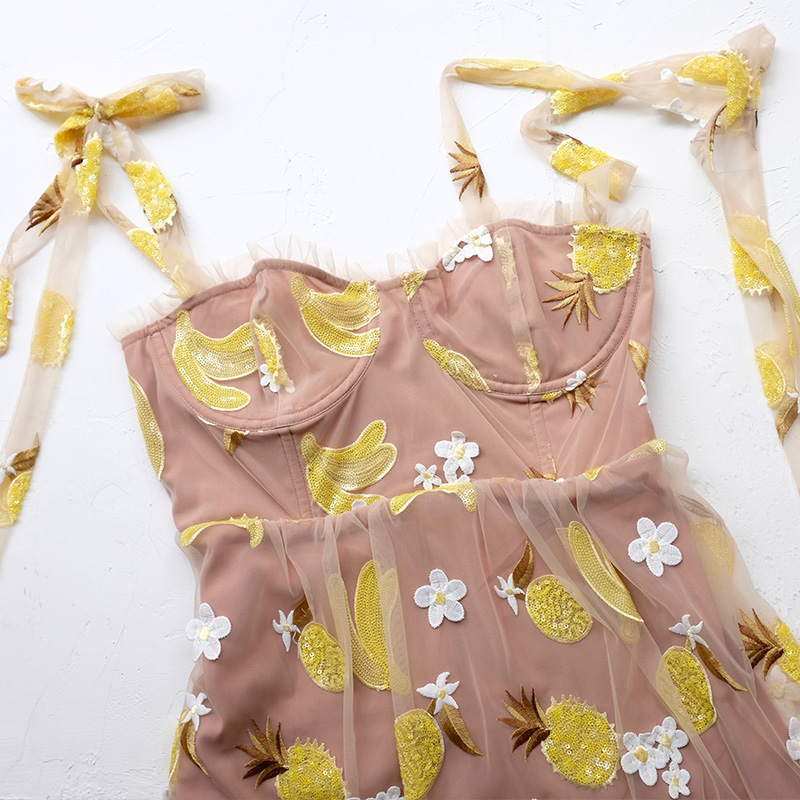 ALICE SEQUIN FRUIT MINI DRESS WITH TIE SHOULDER DETAIL