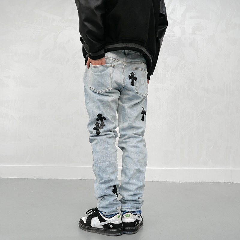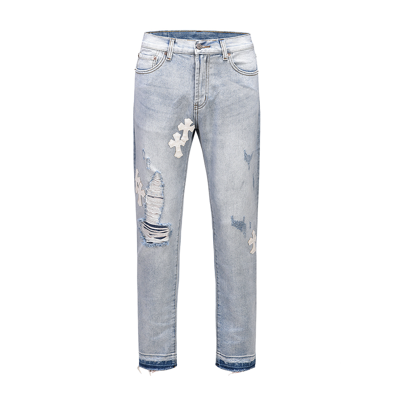 RICKY ELZA CROSS LEATHER PATCH RIPPED DENIM JEAN PANTS