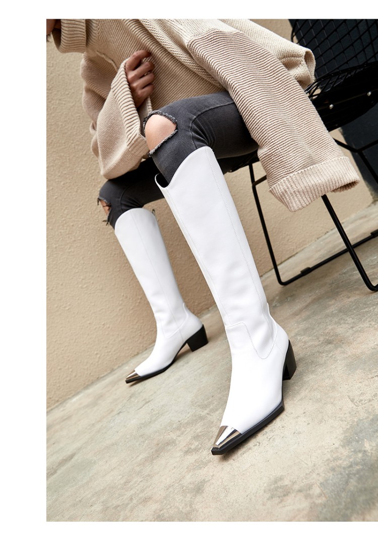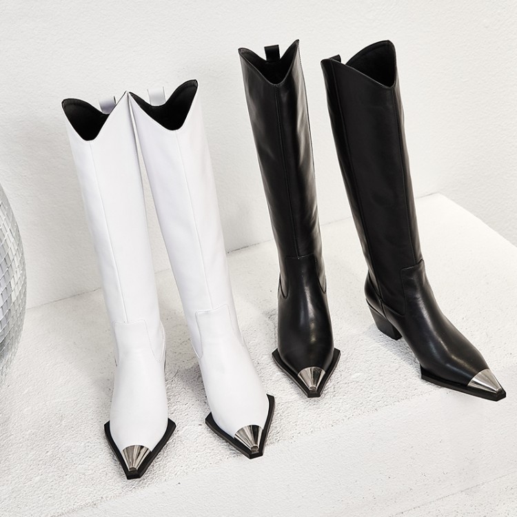MAZZEN WOMIR METAL IRON POINTED HEAD KNEE HIGH LEATHER BOOTS