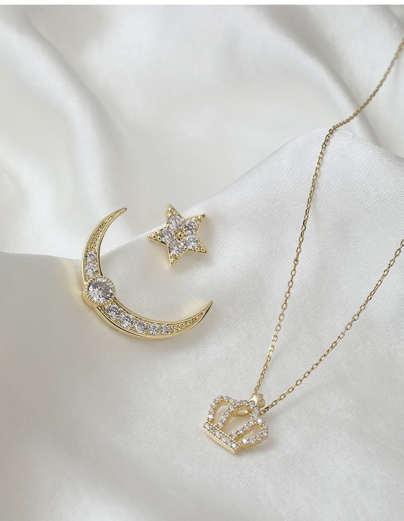 UZL DESIGN CRYSTAL STAR AND MOON STUD EARRINGS IN GOLD PLATED