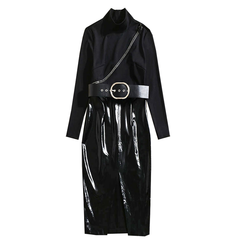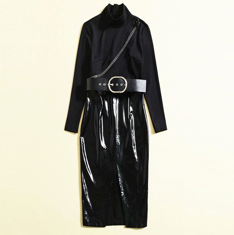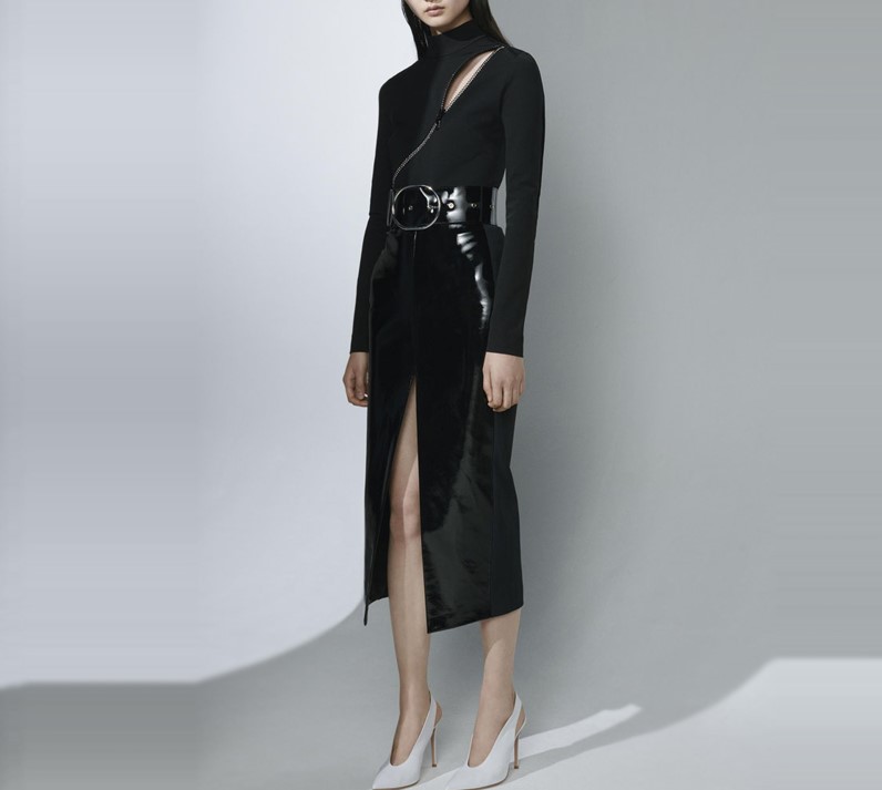 Faux-leather skirt High neck Big belted waist Split leg True to size