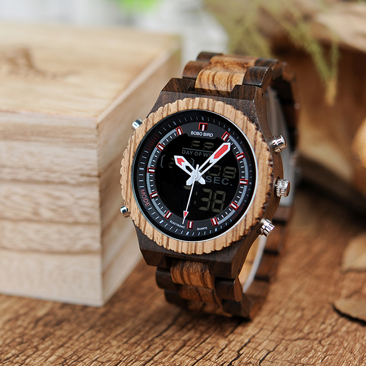 BOBO BIRD LED DOUBLE DISPLAY WOODEN WATCH IN BROWN