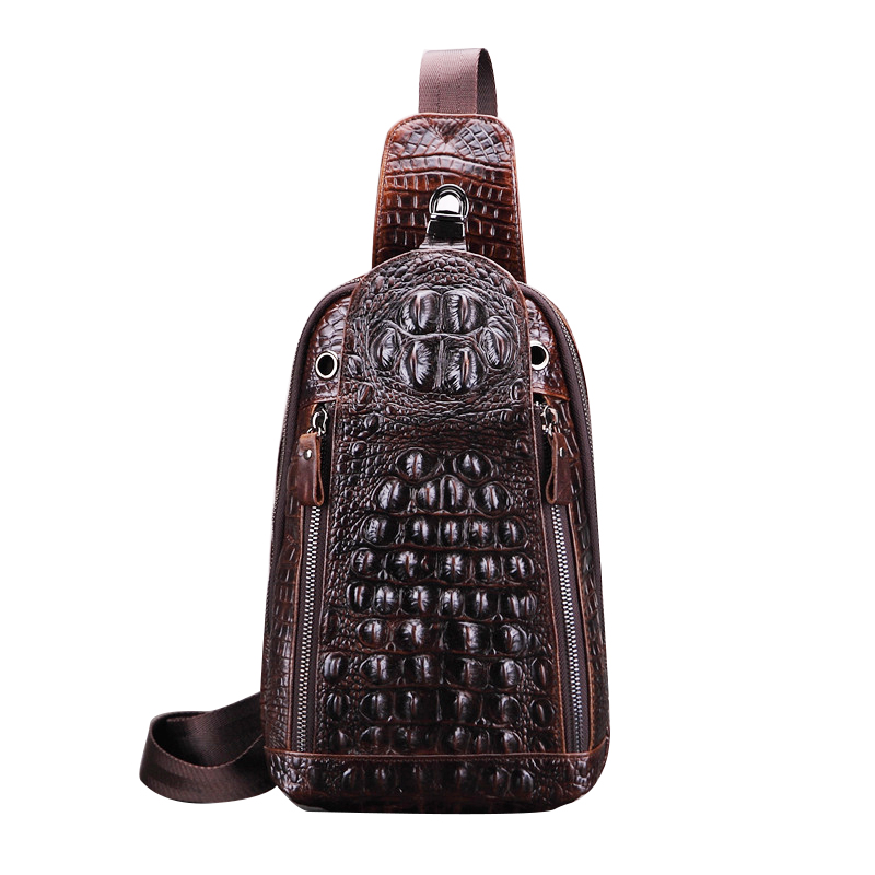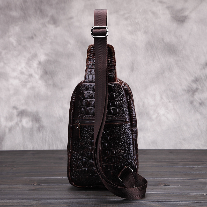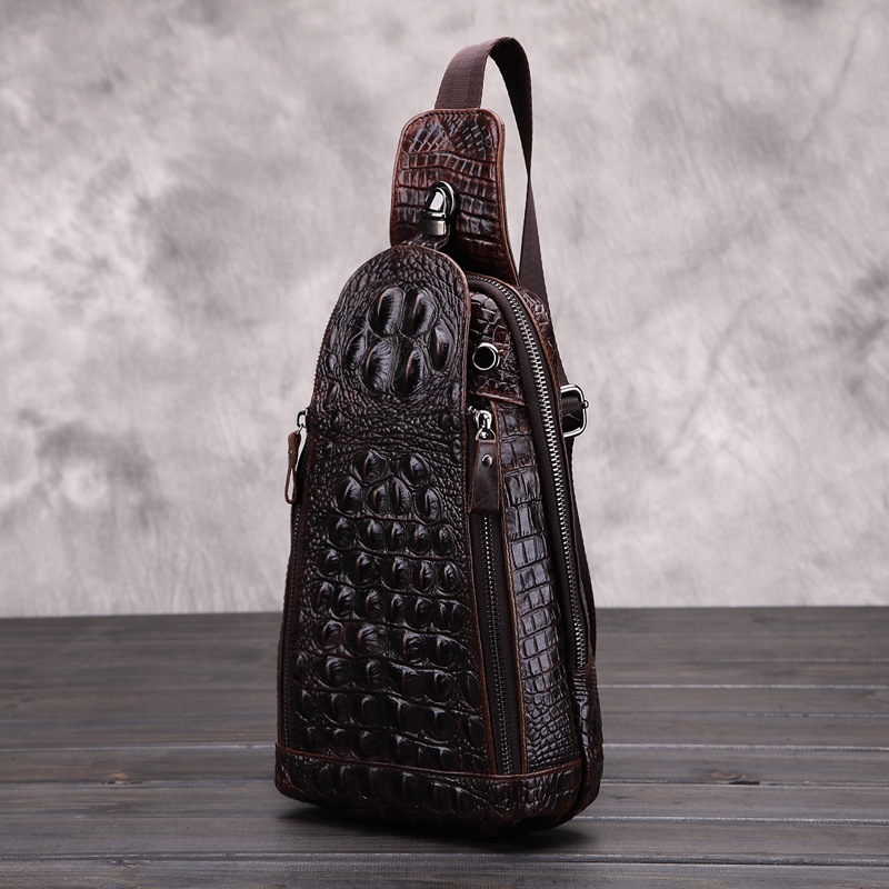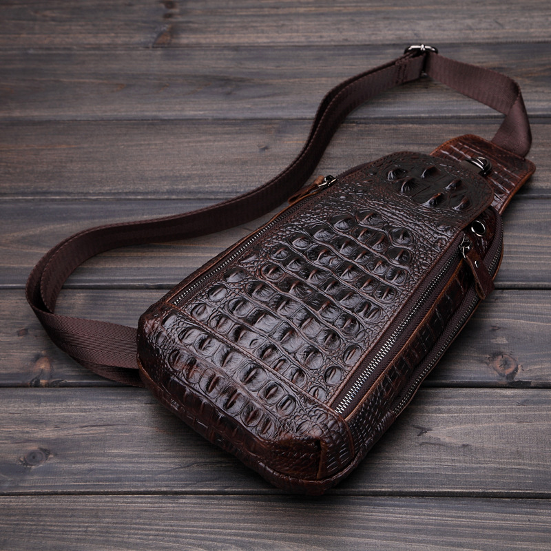 ENVIYO VIRGA VERTICAL CROCODILE LEATHER CHEST MESSENGER BAG IN BROWN