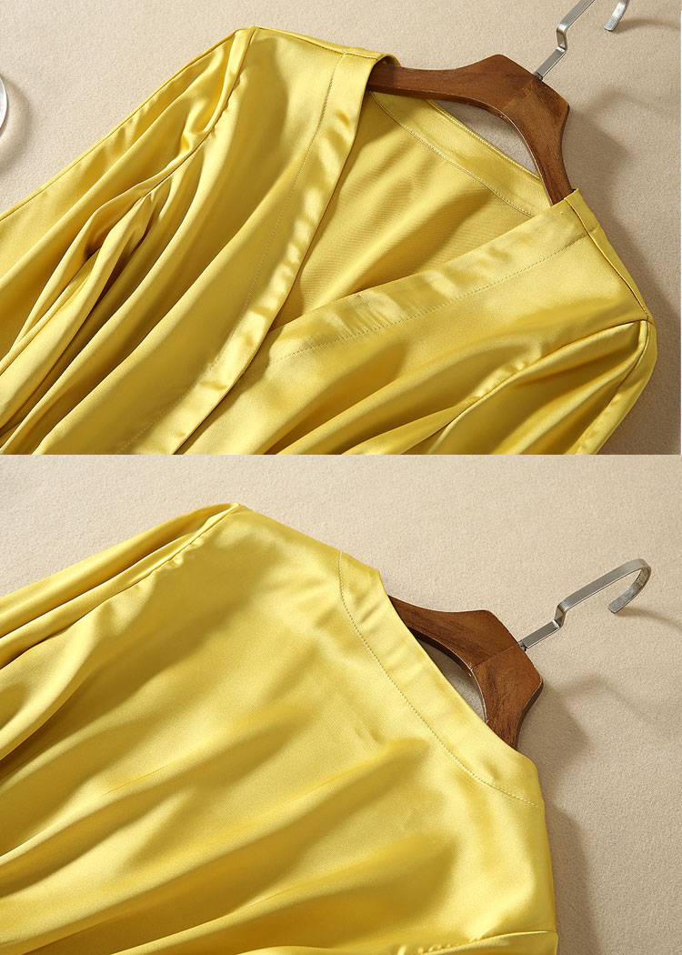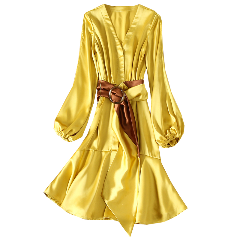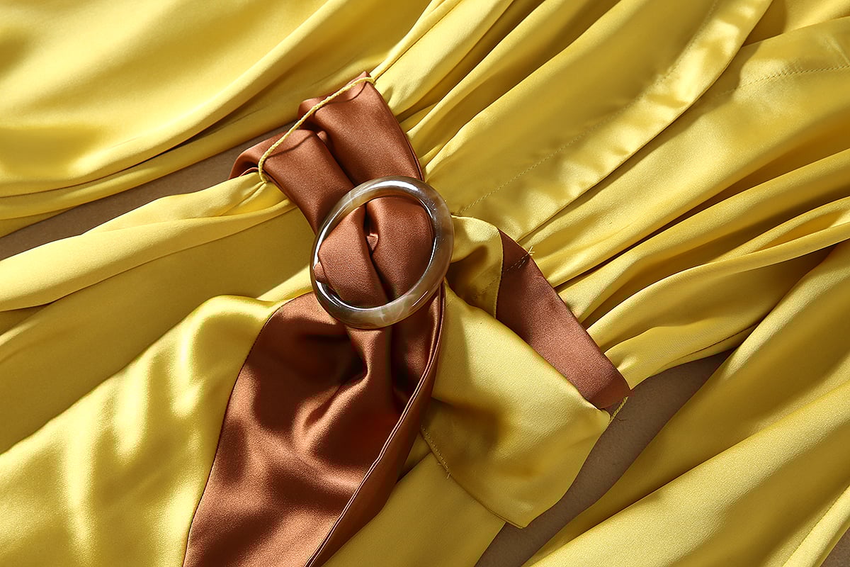 V-neck Frill hem Regular fit Satin-style fabric Silky and super smooth Big belt design