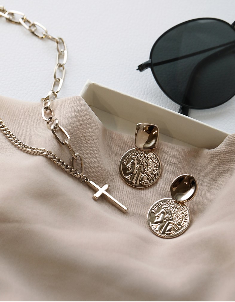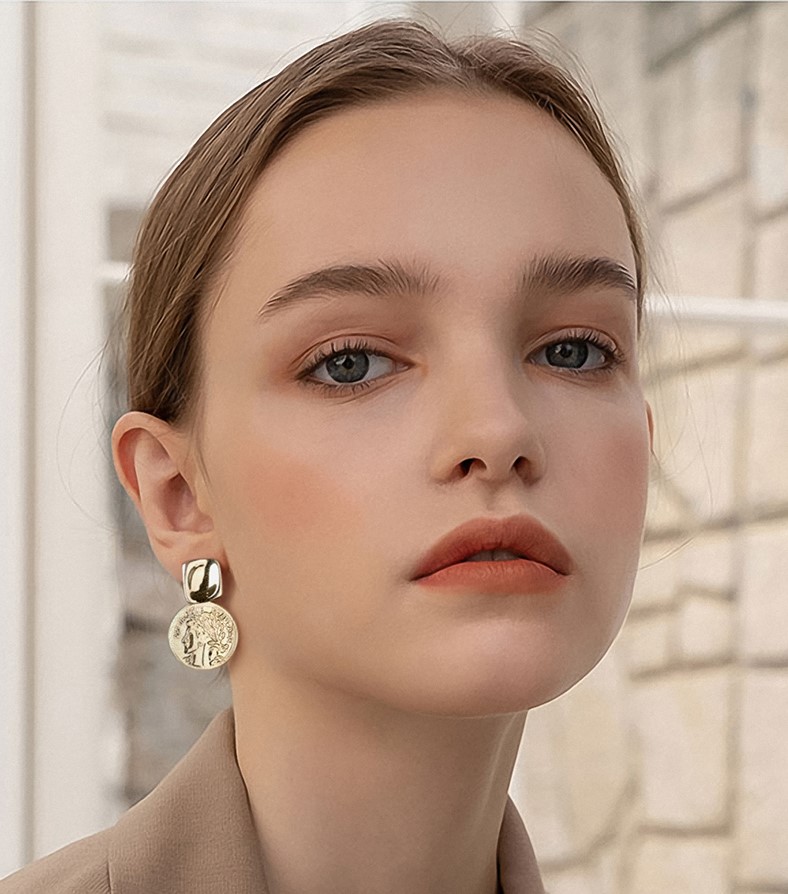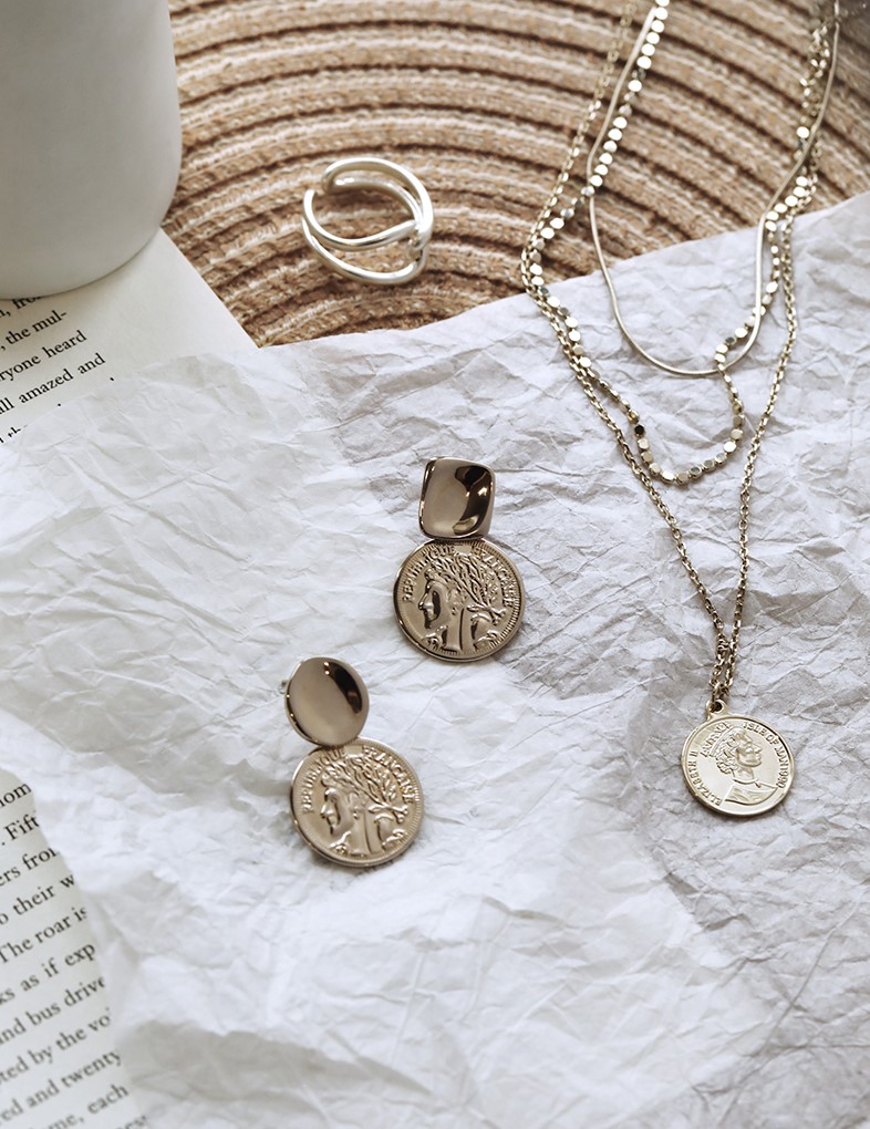 UZL DESIGN GOLD PLATE EARRINGS WITH TEXTURE STUD AND COIN DROP