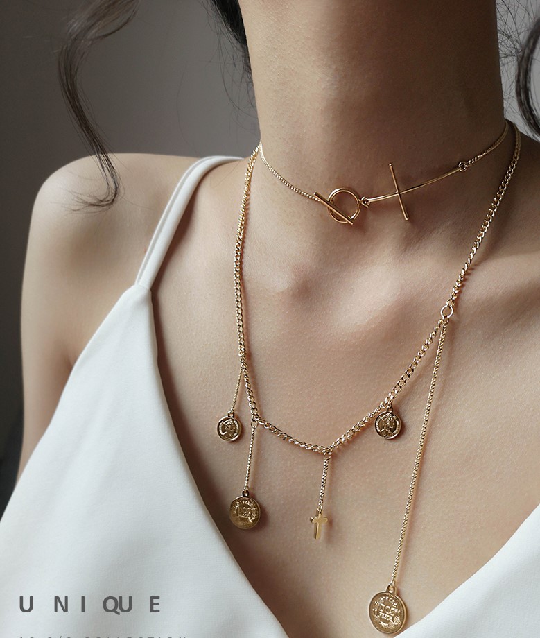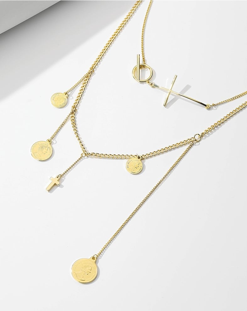 UZL DESIGN GOLD PLATE MULTIROW NECKLACE WITH COIN AND CROSS PENDANT