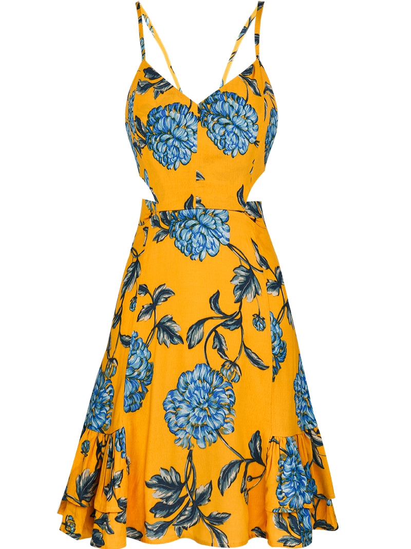 SINCE THEN CROSS BACK FRILL HEM DRESS IN YELLOW FLORAL PRINT