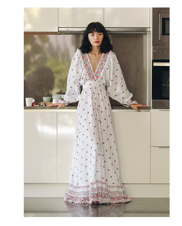 SINCE THEN EMBROIDERED FLORAL MAXI DRESS WITH DEEP V NECK