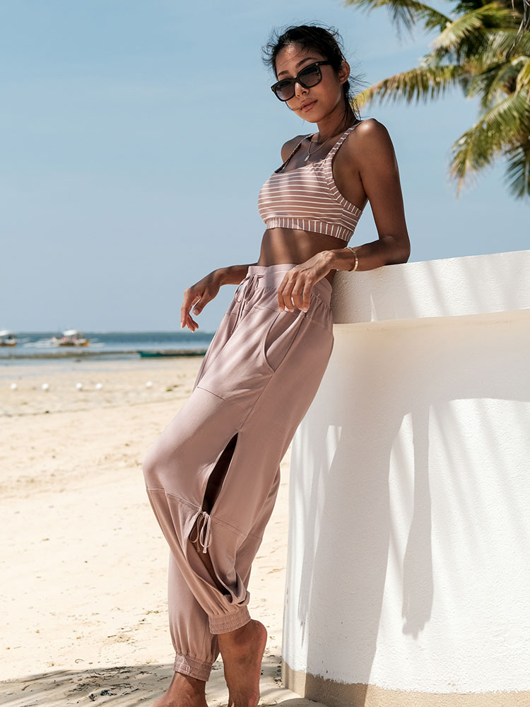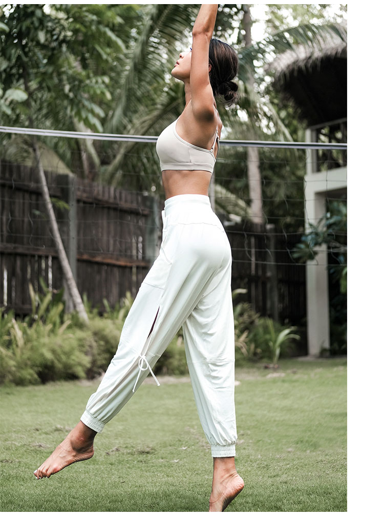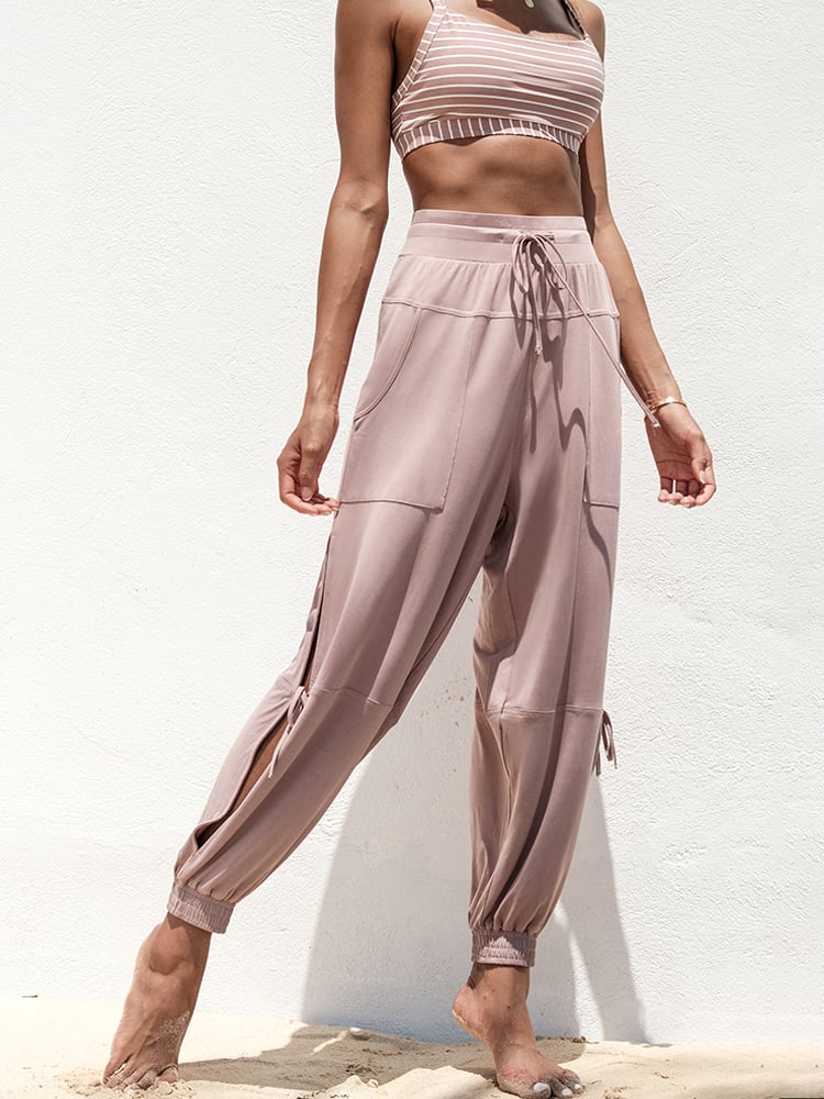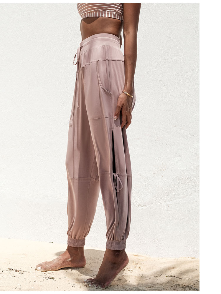 Tie side design High rise Stretch waist and cuffs Side pockets Relaxed balloon leg