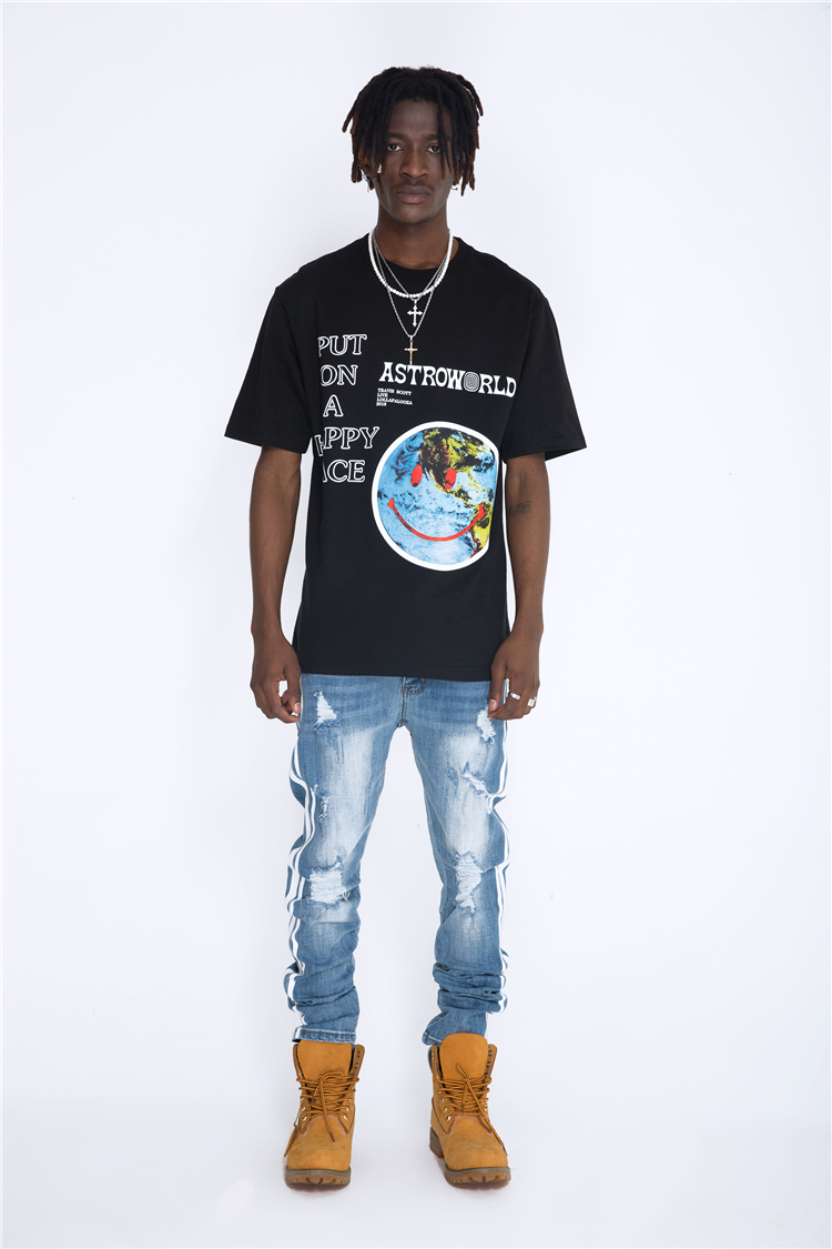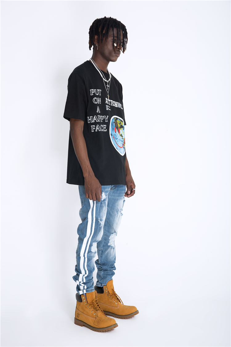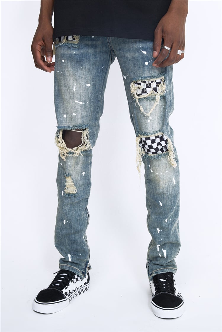 GRAFFINA CHECKER PRINT SPLASH INK RIPPED WASHED DENIM JEAN PANTS