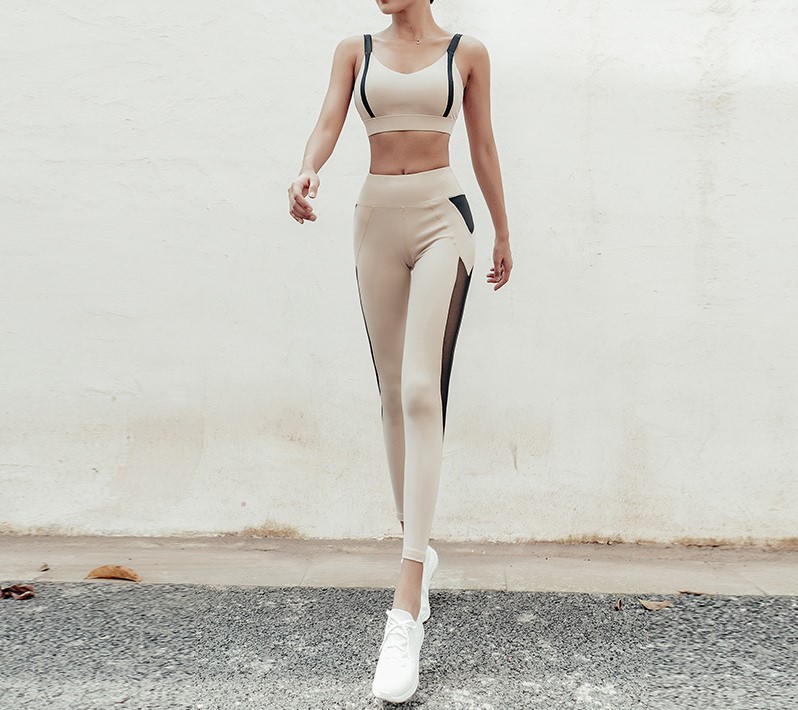 VSEMLEIN DESIGN CONTRAST BREATHABLE MESH PANEL BRA TOP AND LEGGINGS CO ORD