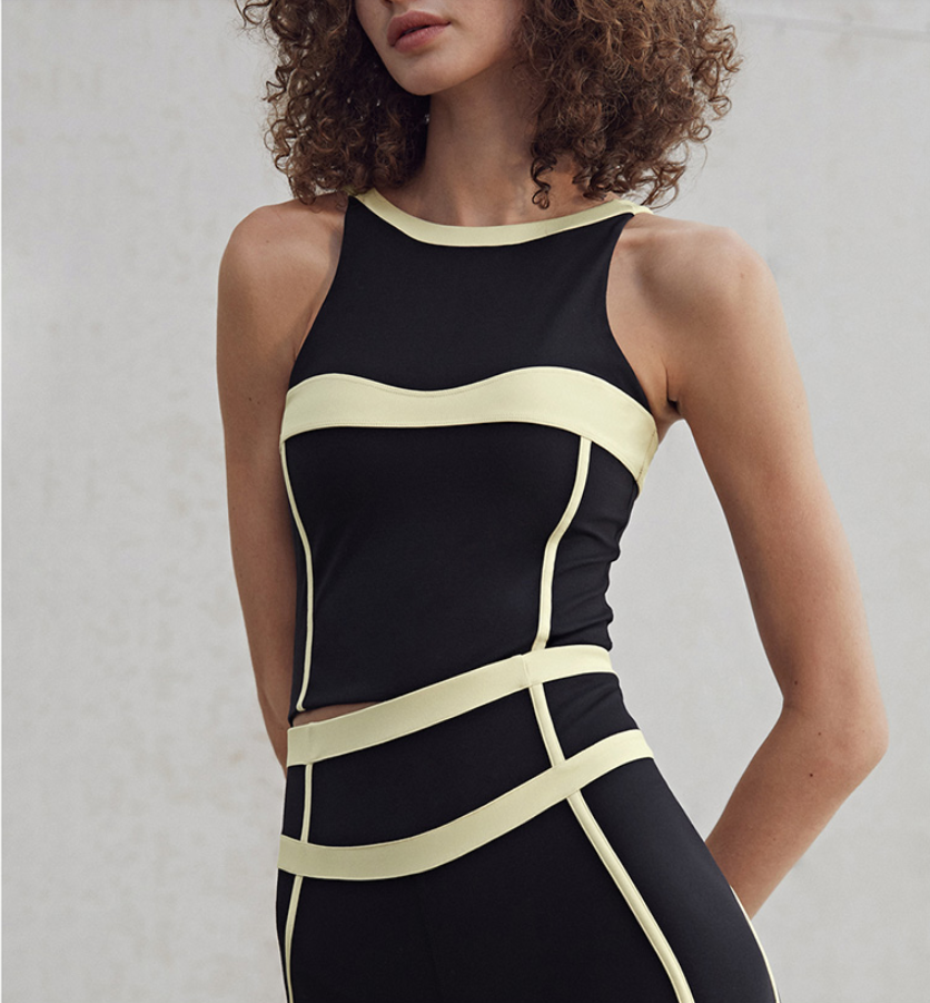 Contrast color design Crew neck Cropped length High rise Close-cut bodycon fit