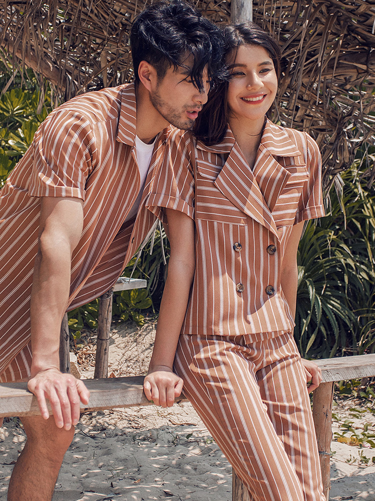 Stripe print Mix and match Short sleeve Button placket Cropped length