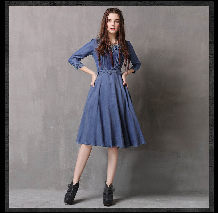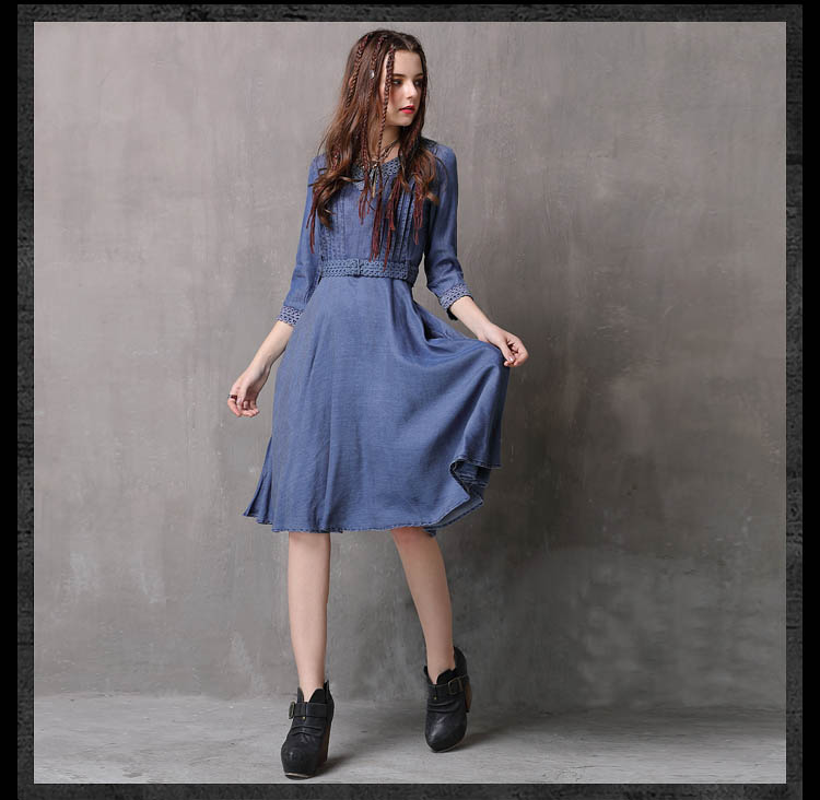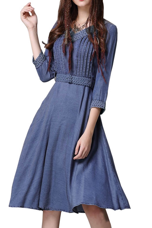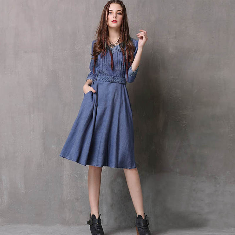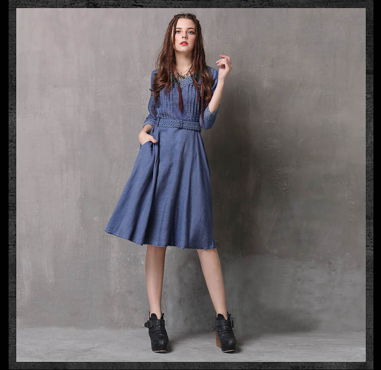 ARTKA KEER ANESTAJIA V NECK MID LENGTH PLEATED DENIM DRESS