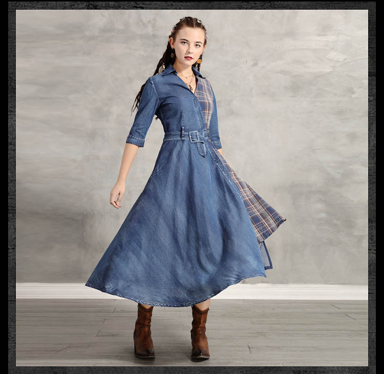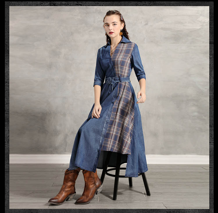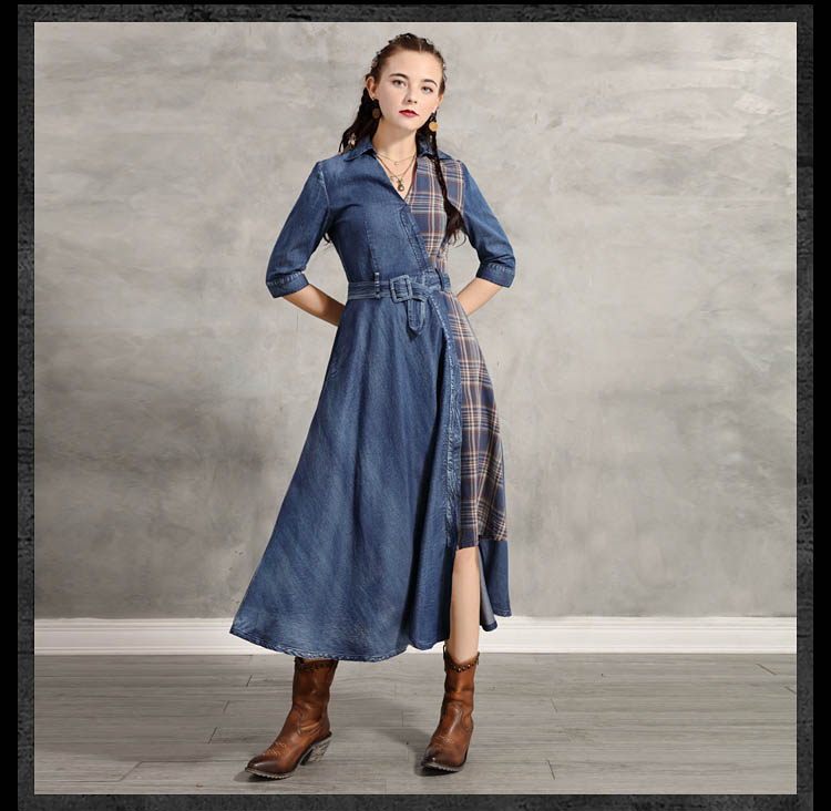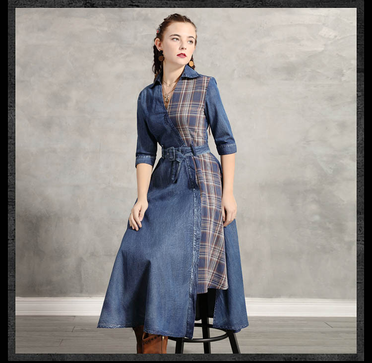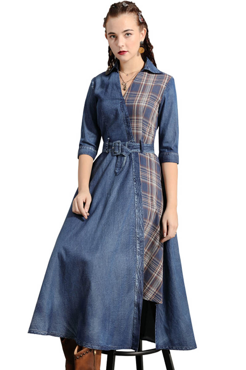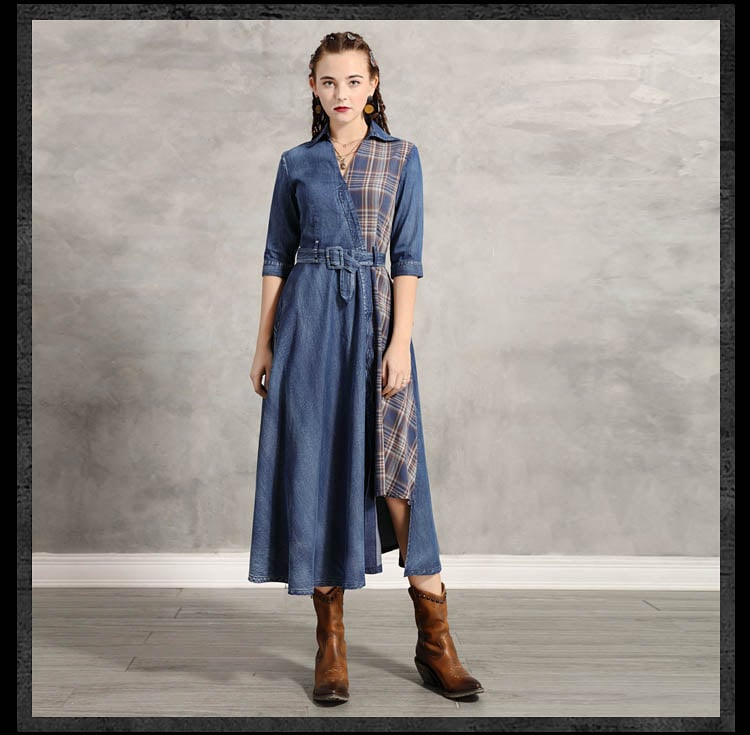 ARTKA EMILY KEER ASYMMETRIC PLAID DENIM JEAN DRESS IN CONTRAST COLOR