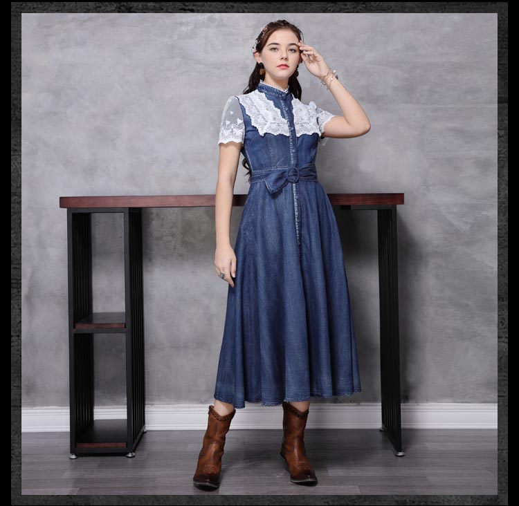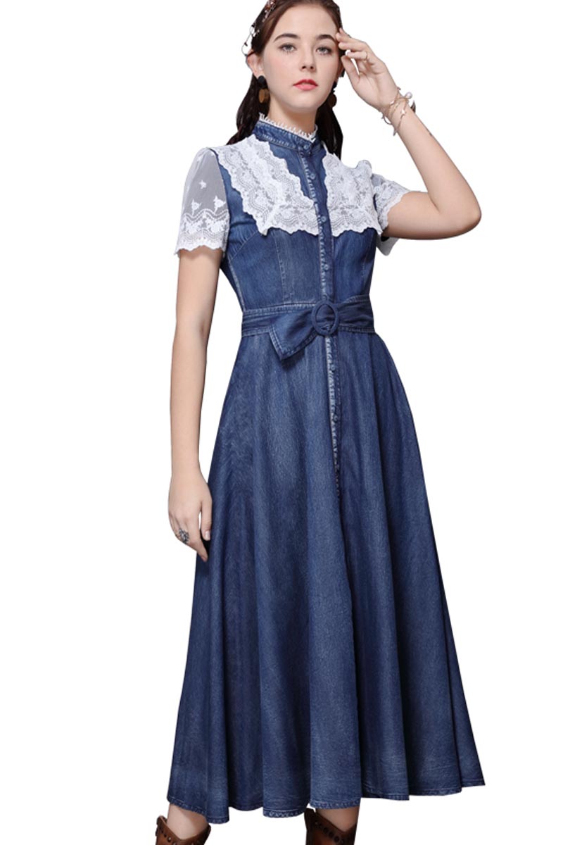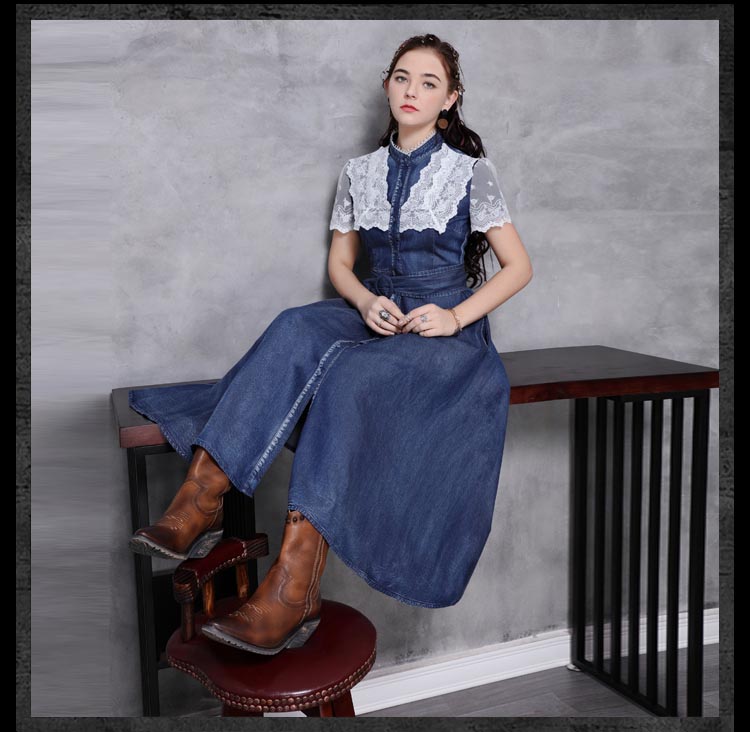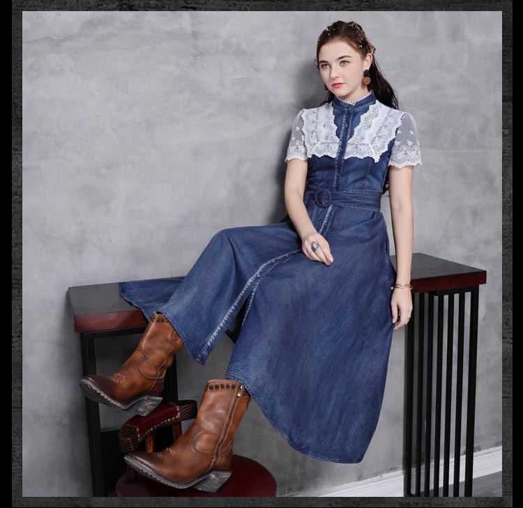 ARTKA MCKINNON KEER HIGH NECK DENIM JEAN MAXI DRESS WITH LACE